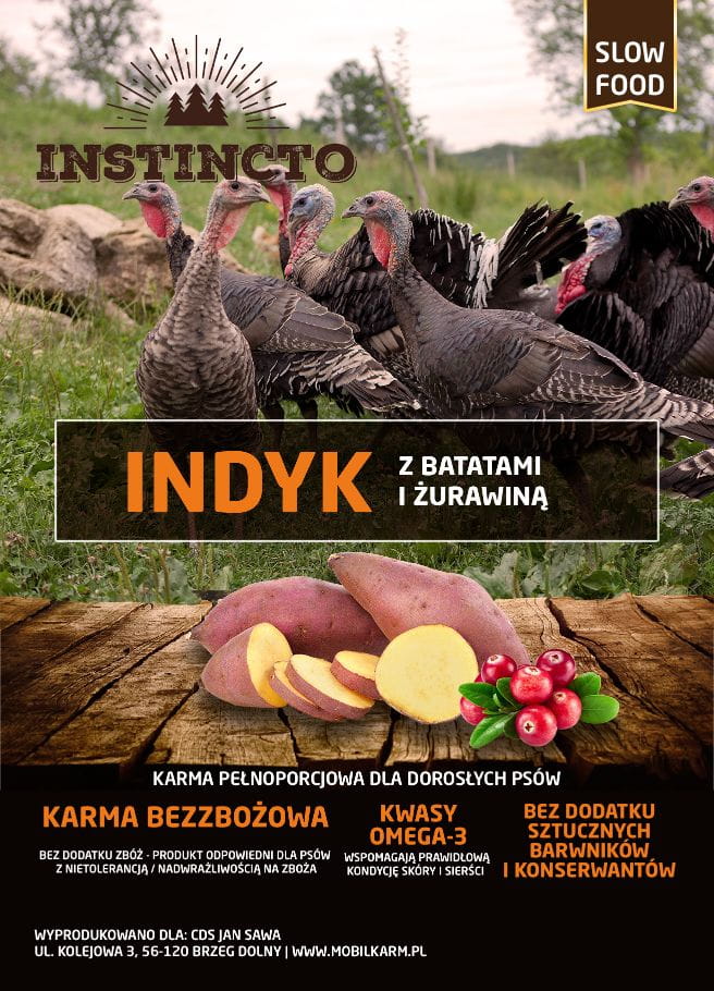 Instincto z indykiem, batatami i żurawiną to bezzbożowa, monobiałkowa karma dla psów wszystkich ras. Jej zbilansowana formuła w pełni zaspokaja potrzeby żywieniowe naszych czworonożnych przyjaciół. Receptura karmy zawiera aż 50% indyka – zarówno w formie świeżej, jak i suszonej. Nie zabrakło w niej także dobroczynnych składników funkcjonalnych, jak np. kwasy tłuszczowe omega-3, czy prebiotyki sprzyjające optymalnemu trawieniu. To czego nie znajdziesz w naszej karmie to sztuczne barwniki i konserwanty – zbędnej chemii mówimy NIE! W tej formule zrezygnowaliśmy również z białka oraz tłuszczu kurczaka.